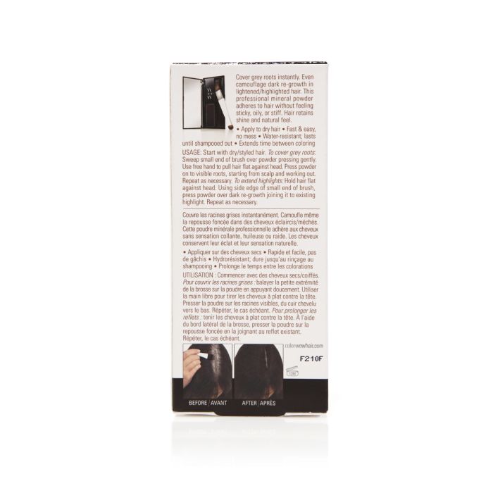 Anwendung: Auf trockenes Haar auftragen. Verwenden Sie das kleine Ende des Pinsels, um das Puder aufzunehmen, und drücken Sie fest auf die Ansätze, beginnend von der Kopfhaut nach außen. Vermeiden Sie Wischbewegungen. Wiederholen Sie den Vorgang, um die gewünschte Abdeckung zu erreichen. Um die Highlights zu verbreiten, verwenden Sie die seitliche Kante des kleinen Pinsels. Entfernen Sie überschüssiges Puder mit dem breiten Ende des Pinsels.