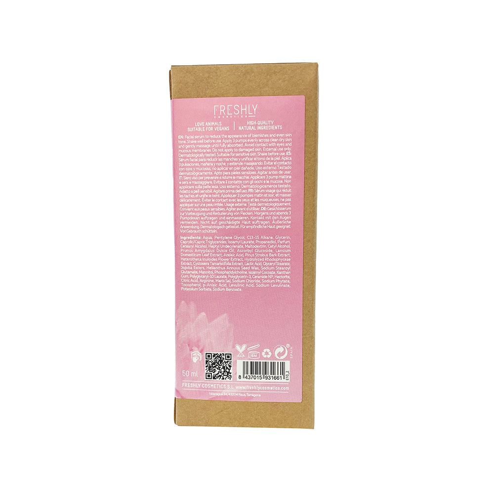 Gesichtsseren Creme von Freshly Cosmetics, die Melanin selektiv abbaut und so bestehende Flecken reduziert und die Gesamtfunktion der Melanozyten verbessert, um das Auftreten neuer Flecken zu verhindern. Macht deine Haut strahlender und gleichmäßiger.