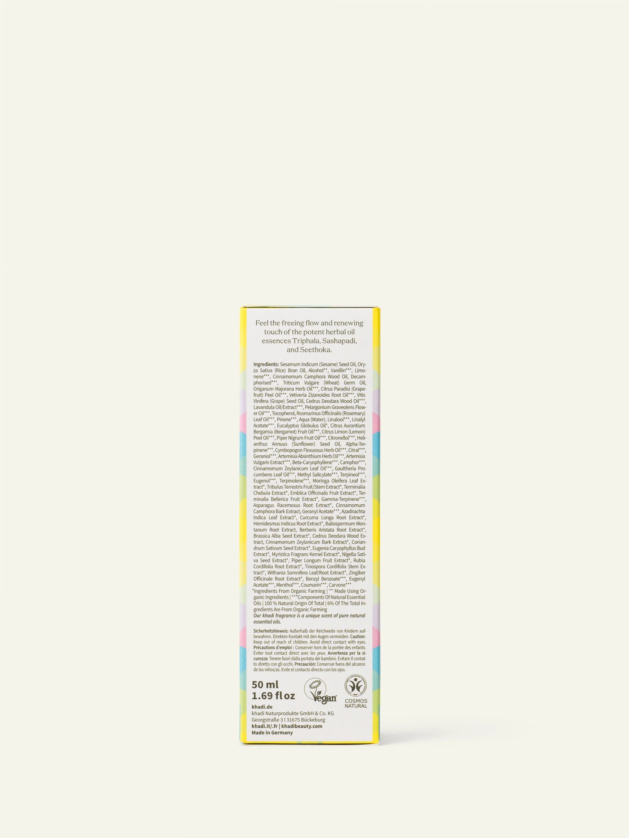Ingredients: Oryza Sativa Bran Oil*, Sesamum Indicum Seed Oil*, Vanillin, Alcohol denat., Limonene**, Citrus Paradisi Peel Oil, Terminalia Chebula Fruit Extract*, Emblica Officinalis Fruit Extract*, Terminalia Bellerica Fruit Extract*, Moringa Oleifera Leaf Extract*, Asparagus Racemosus Root Extract, Tribulus Terrestris Seed Extract, Cinnamomum Camphora Bark Extract, Curcuma Longa Root Extract*, Azadirachta Indica Leaf Extract*, Coriandrum Sativum Seed Extract, Nigella Sativa Seed Extract, Brassica Alba Seed Extract, Piper Longum Seed Extract, Myristica Fragrans Fruit Extract, Eugenia Caryophyllus Bud Extract, Cinnamomum Cassia Bark Extract, Baliospermum Montanum Root Extract, Withania Somnifera Root Extract, Hemidesmus Indicus Root Extract*, Zingiber Officinale Root Extract, Berberis Aristata Root Extract, Tinospora Cordifolia Root Extract, Rubia Cordifolia Root Extract, Cedrus Deodara Wood Extract, Triticum Vulgare Germ Oil, Vitis Vinifera Seed Oil, Tocopherol, Eucalyptus Globulus Leaf Oil, Vetiveria Zizanoides Root Oil, Pelargonium Graveolens Oil, Rosmarinus Officinalis Leaf Oil, Cinnamomum Camphora Bark Oil, Citrus Limon Peel Oil, Piper Nigrum Fruit Oil, Cinnamomum Zeylanicum Leaf Oil, Lavandula Angustifolia Oil, Citrus Aurantium Bergamia Fruit Oil, Gaultheria Procumbens Leaf Oil, Origanum Majorana Herb Oil, Citral**, Linalool**, Geraniol**, Benzyl Benzoate**, Citronellol**, Eugenol**, Cinnamal**.