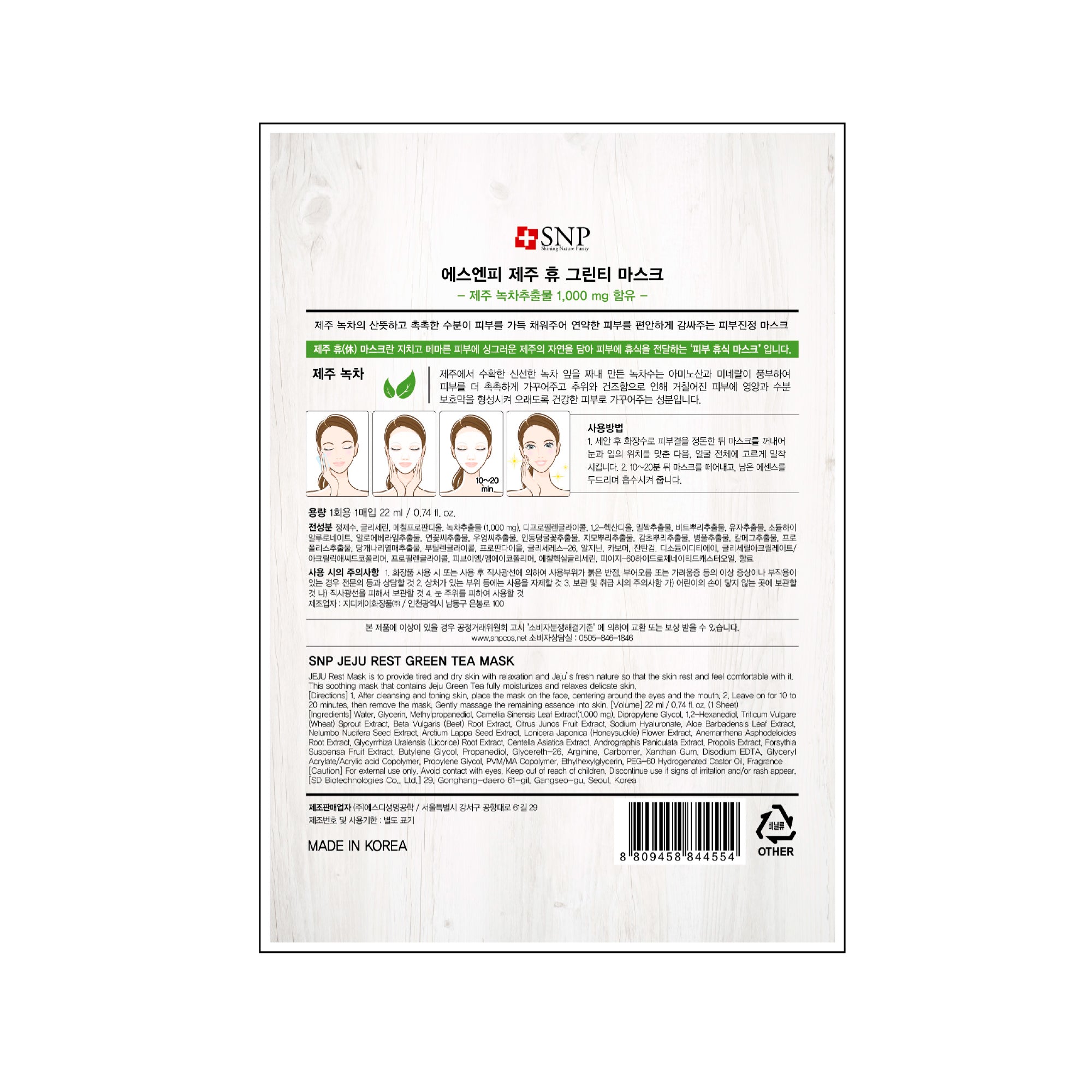 Die beruhigende SNP Maske mit grünem Tee-Wasser, das die Hautbarriere auffüllt und der Haut ein gesünderes Aussehen verleiht. Reich an Aminosäuren und Mineralien von der Insel Jeju, die die Haut beruhigen und entspannen.