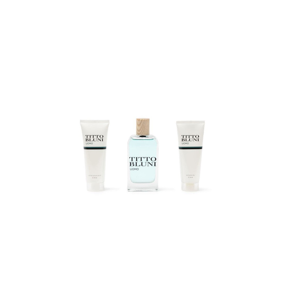 Geschenkset für Herren von Titto Bluni Uomo. Enthält den maskulinen Duft Titto Bluni, ein eleganter Duft aus der orientalisch-holzigen Duftfamilie. Kommt in einem transparenten Glasflakon. Die Kopfnoten umfassen Pflaume, Eichenmoos, Apfel, Zitrone, Bergamotte und Geranie. Herznoten sind Mahagoni, Nelke und Zimt. Basisnoten umfassen Sandelholz, Olivenbaum, Vanille, Vetiver und Zeder.