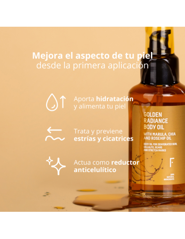 Körperöl Golden Radiance von Freshly Cosmetics nährt Ihre Haut tief und verbessert ihr Aussehen sofort, da es Dehnungsstreifen und Reizungen vorbeugt und reduziert. Enthält Marulaöl, Babassuöl, Haselnussöl, Jojobaöl, Hagebuttensamenöl, Avocadoöl, Macadamiaöl und mehr, die das Aussehen von Narben verbessern und der Hautalterung vorbeugen. Hinterlässt die Haut weich und saftig und verbessert ihre Elastizität und Festigkeit.