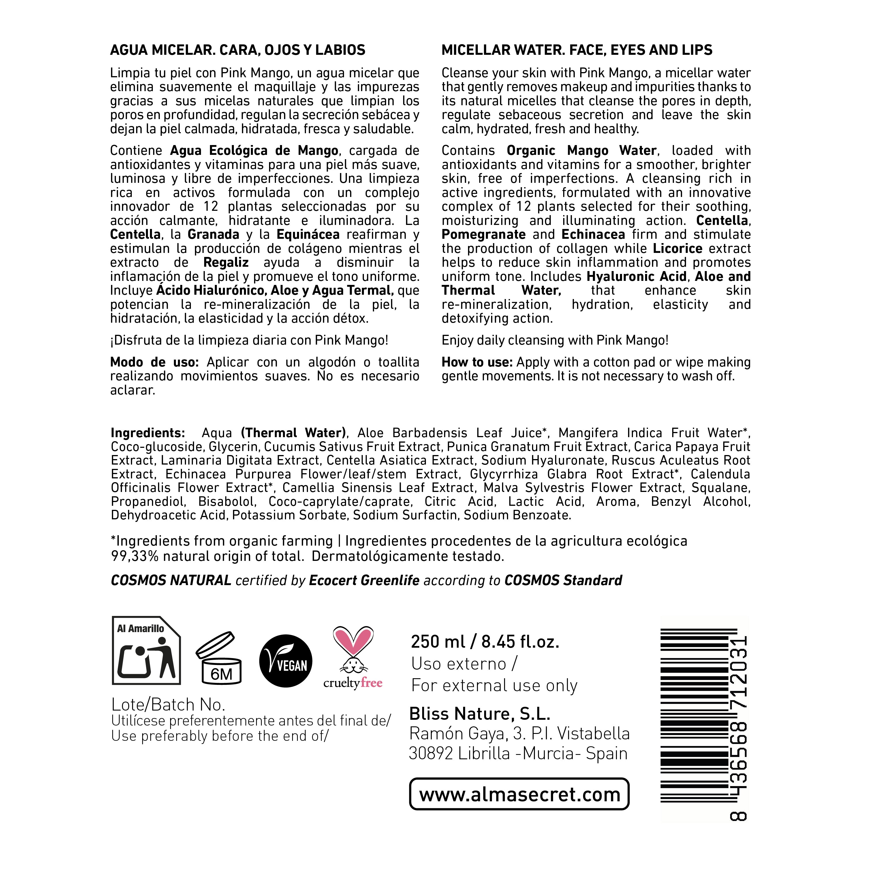 Effektive und unwiderstehliche Pink Mango mit ihrem natürlichen und exotischen Aroma von Mango und Papaya. Entfernt sanft Make-up und Unreinheiten. Seine natürlichen Mizellen reinigen die Poren gründlich, regulieren die Talgsekretion und sorgen für eine ruhige, hydratisierte, frische und gesunde Haut. Seine Formel enthält Thermalwasser, das die Haut beruhigt und ausgleicht, Feuchtigkeit länger speichert, ihre natürliche Hydratation bewahrt und ihren natürlichen Reparaturprozess beschleunigt.
